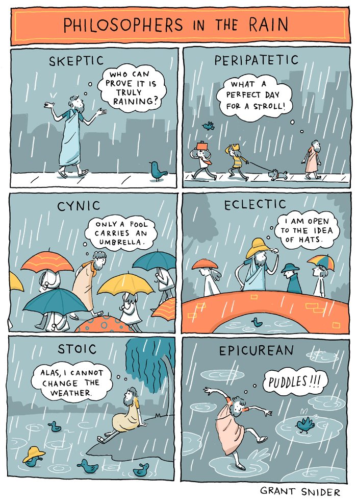 - Exploring old world philosophies on life which ring true today and will well into the future (Stoicism, Cynicism, Epicureanism, Skepticism, Pragmatism, Dogmatism, Buddhism, Christianity, Humanism, Existentialism, Nihilism)